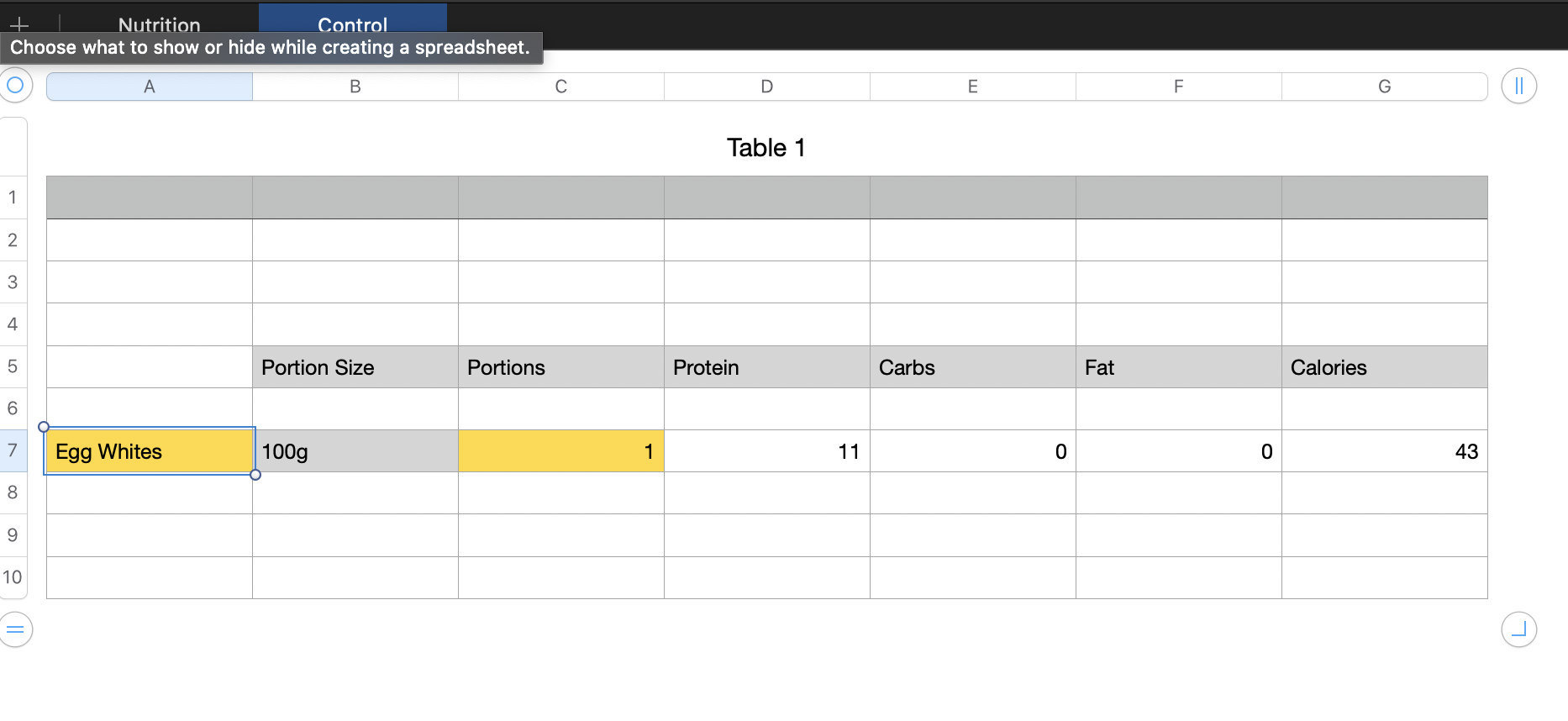 In the image below, the user has chosen "Food 8" from the popup menu in cell A6 and "Egg White" from the pop-up menu in cell A9, causing cells in columns B through G of those rows to be filled with the data from the rows of Data containing "Food 8" and "Egg White" in column A.