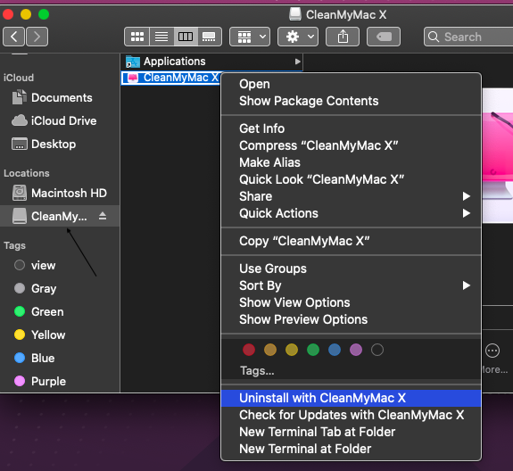Another method is open finder , right click on clean my Mac and eject it ( shown with arrow under locations in finder side bar ) .