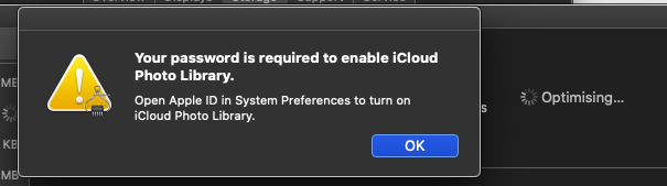 When I go to >about this mac>storage>manage>store in icloud it says "Your password is required to enable iCloud Photo Library. Open Apple ID in System Preferences to turn on iCloud Photo Library." The thing is im already logged in. When I go system preferences>apple ID i can see my email etc. so it's my account. I can't select the store in icloud option. How can I solve this problem?