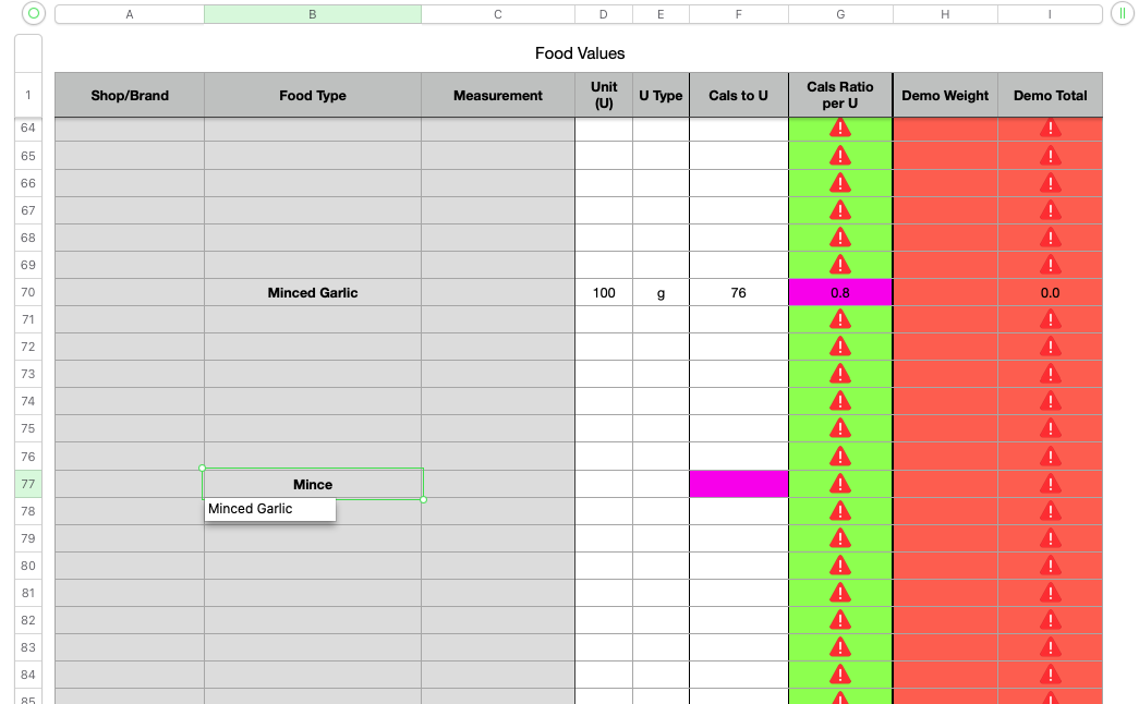 The contented of the two cells in column B of the example contain different values—a function searching for "Mince" (B77) will not find "Minced Garlic" (B70), and will return an error.