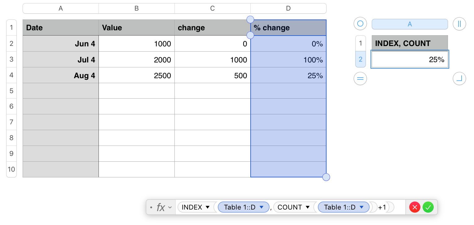 CELL A1: [always the last value from the 'PERCENTAGE CHANGE column in Table 1 - updating when ever a new row is competed in that column].