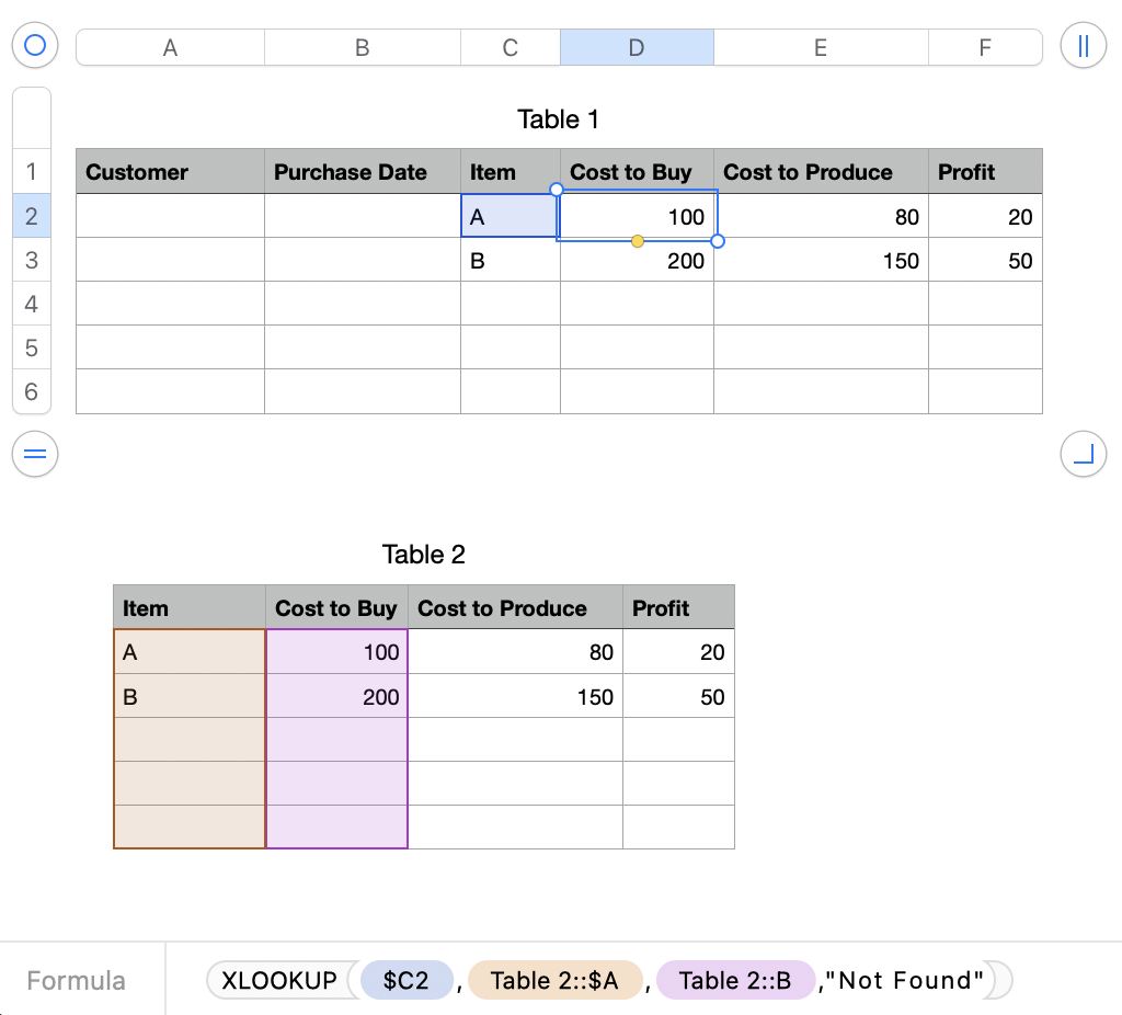 I have also created in a separate table the Item purchased | Item Cost | Item Cost to produce | Profit in the hopes I would be able to link them together but I can't figure out how.