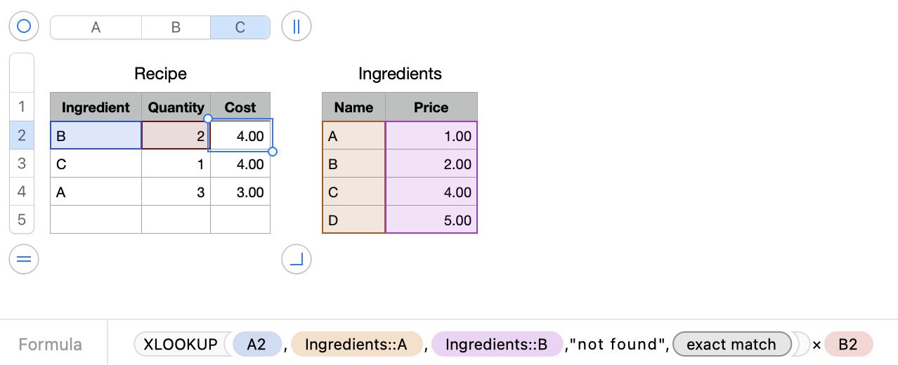 =XLOOKUP(A2,Ingredients::A,Ingredients::B,"not found",0)*B2