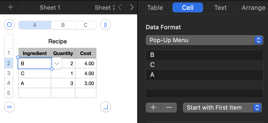 I’m trying to create a recipe in a table on one sheet that has drop down boxes for my ingredients that are referenced back to a another sheet with all my ingredients and their prices. And after selecting that item I need it to automatically calculate my cost for that item based on the quantity I enter on the recipe table and the cost per unit info from my ingredient price sheet. I’ve seen how to do it in excel but can’t figure out on my brand new MacBook Air. Any ideas?