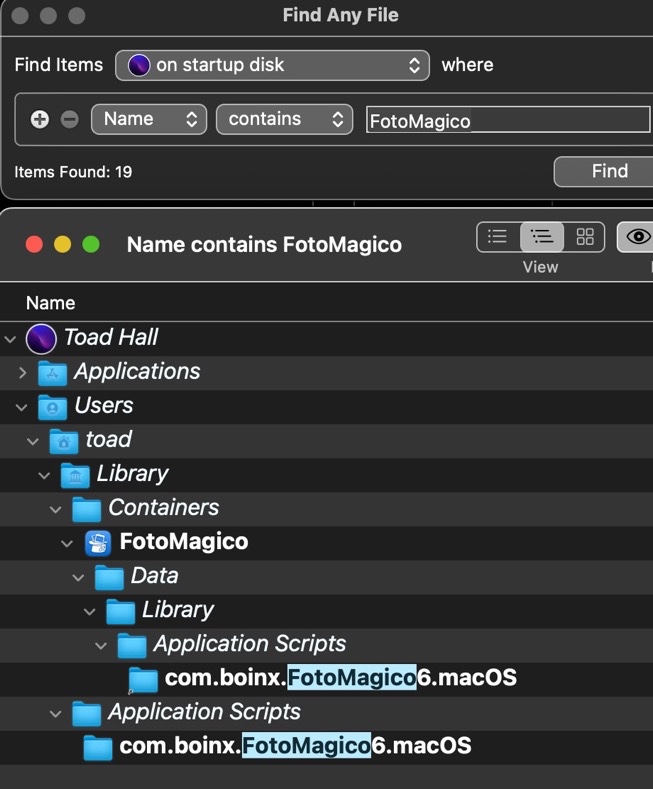 If the app was then you can use the shareware app Find Any File to search for any files with the application's or the developer's name in the file name. For FotoMagico software you'd do the following search(es):