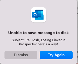 I get the below message all the time when using Microsoft outlook for mac, but only on my mac mini. My macbook pro's have zero issues with this. I just dismiss it and keep going, and don't believe there is any negative impact aside from the annoyance. This has been going on for probably a year or so. I'm running the latest Outlook for Mac, version 16.65, and the latest OS for mac Monterey Version 12.4. My mac mini is the M1, 2020, memory 16gb with 607gb of a 1tb limit on hard drive so not overdoing anything. It does have the M1 chip which seems to have problems with various things.