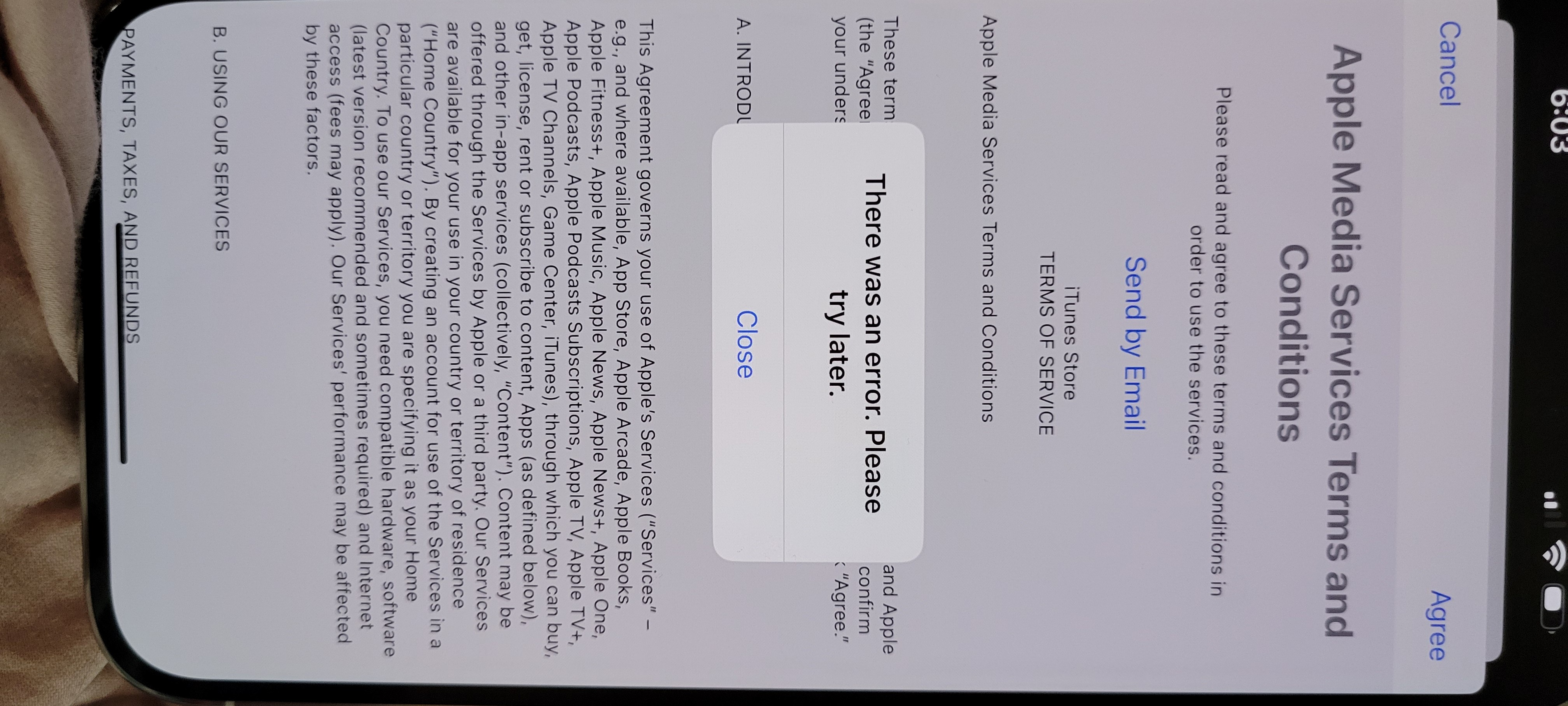When I try to install any app it has a pop up for Apple Media services terms and conditions I push ok a d it sends me to the terms and conditions page to agree when I do agree it has a pop up that says There was an error please try later. I'm not able to use my phone for any app