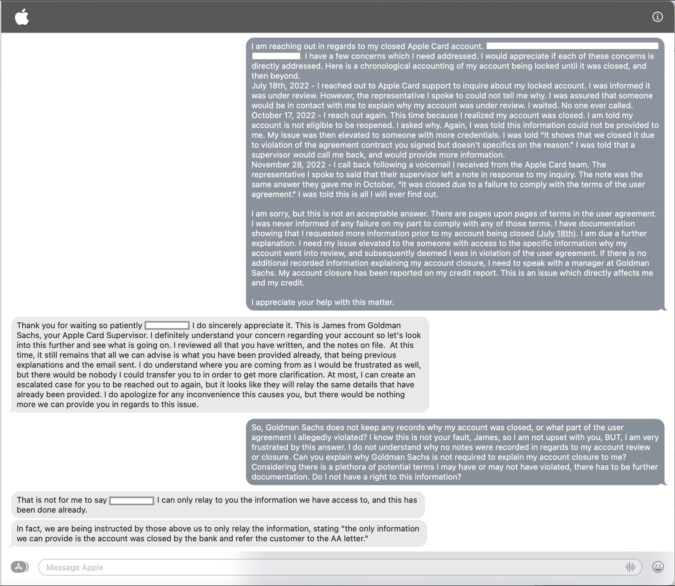 Here is a brief summary of the situation in which I find myself. I was an Apple Card holder. I am no longer; Apple / Goldman Sachs closed my account. I have reached out to Apple Card Support on multiple occasions following my account closure. Initially, the representatives with whom I spoke did not have the credentials to offer me any information as to my account closure. Eventually, after having my case elevated multiple times, I was informed by an Apple Card Manager at Goldman Sachs that my account was closed because of (and I quote), "there was a failure to comply with the terms of the Customer Agreement." I responded, "can you tell me what terms with which I failed to comply?" Goldman Sachs says, "sorry, no."