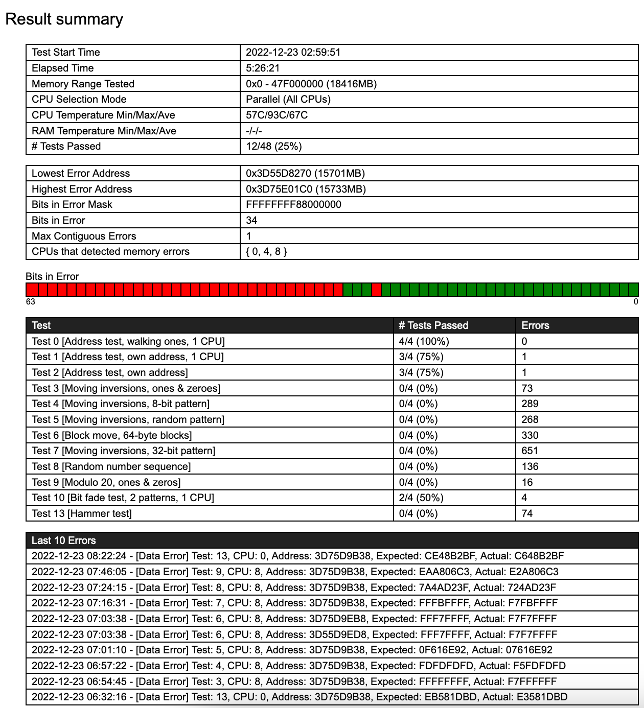 Hey there all - I have a 2019 macbook pro that has been continually crashing randomly, web tabs closing, apps / finder / spotlight not working right for a long while now. After reading this thread last night, I decided to run a memtest86 just like Razzler recommended. I got a ton of errors, and I've attached the results. Do I just need to replace the computer? Or can I get it fixed at the apple store. I've out of AppleCare, so I'm not really sure what to do next.