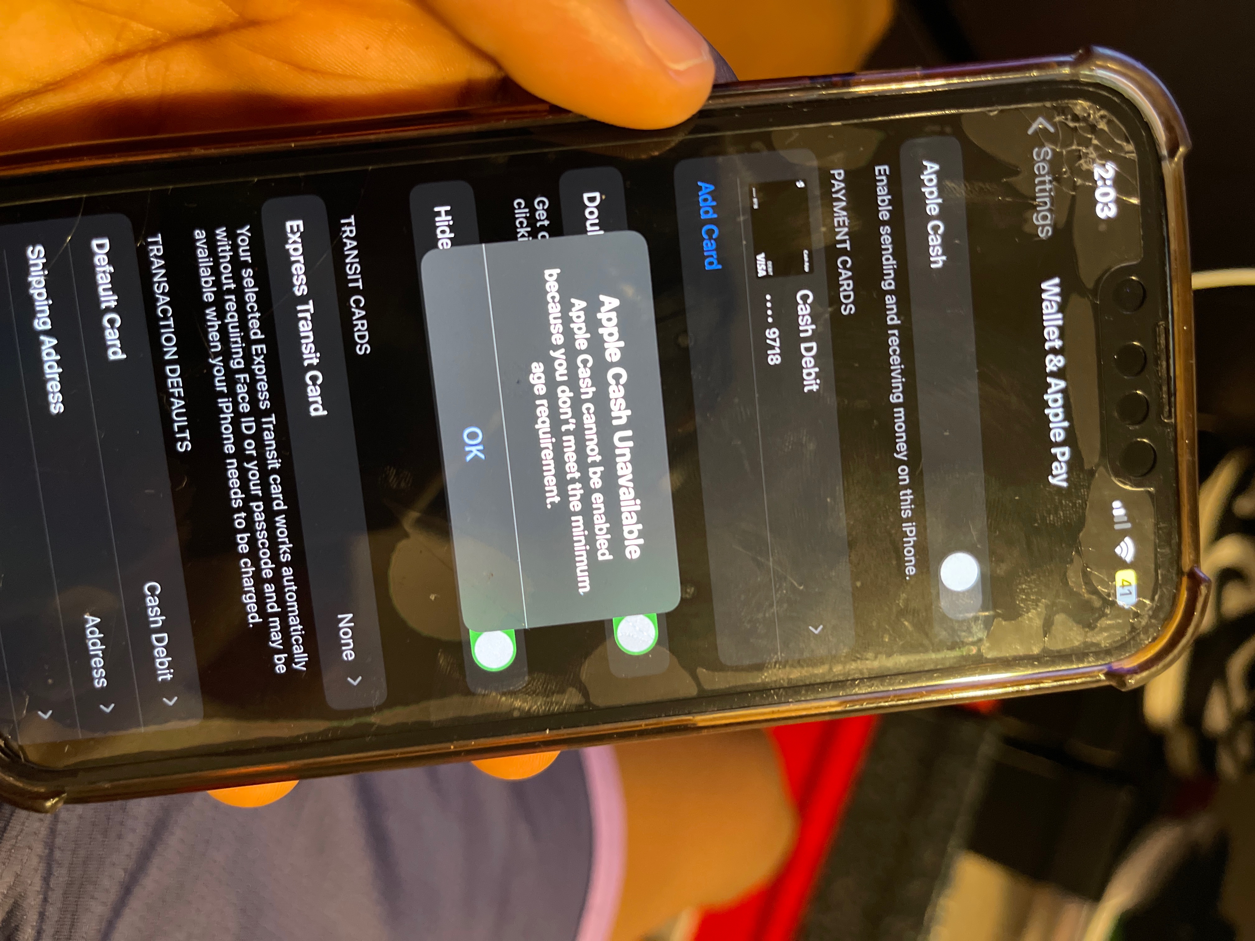 I tried enabling Apple Pay on my sons phone and it isn’t allowing me too it says he already has it enabled but when we go to his phone and turn it on it says he’s under the age requirement