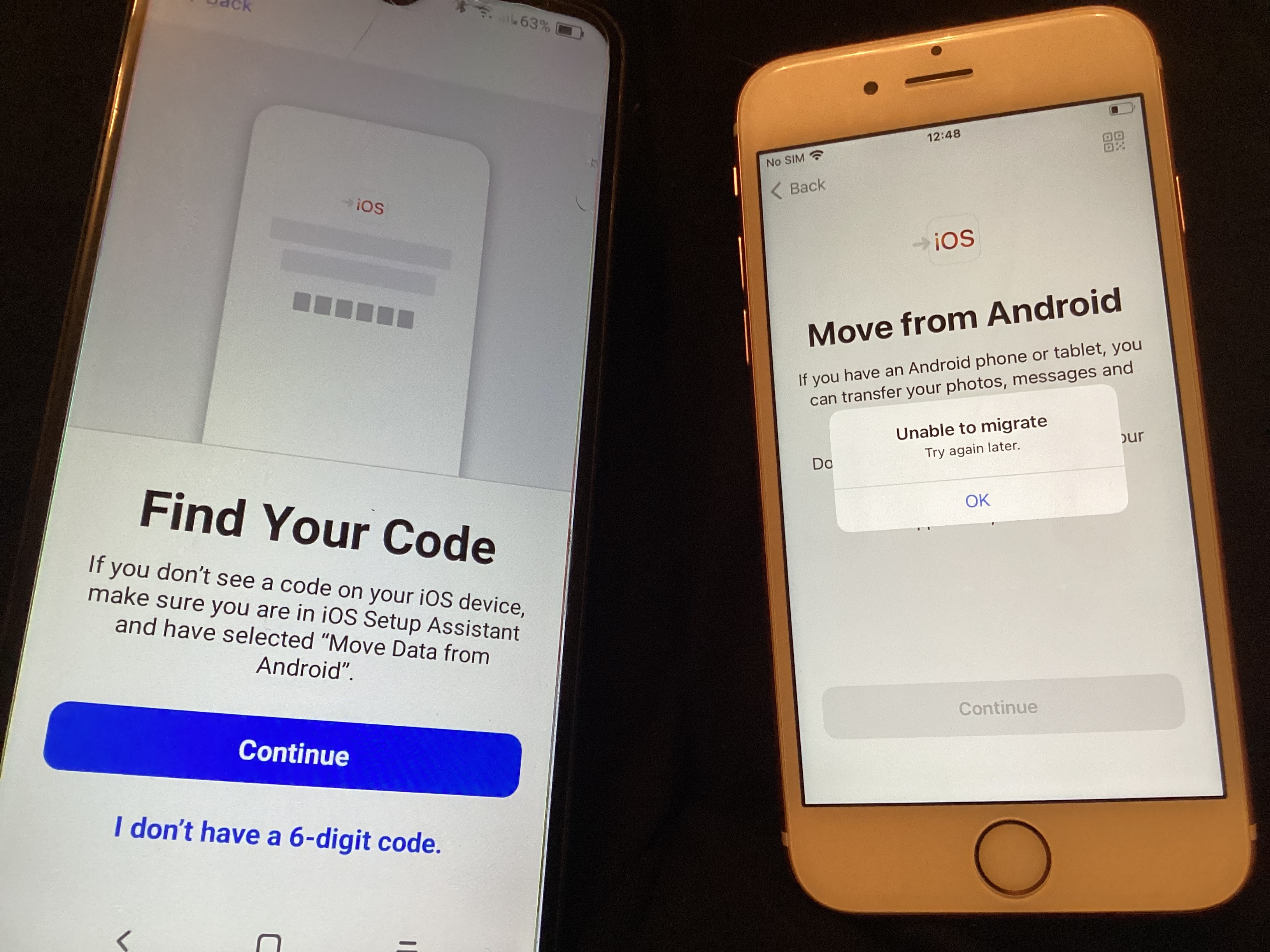 I get the “Unable to migrate. Try again later.” error when I try to transfer data from an old Android phone to iPhone. Why and what can I do?