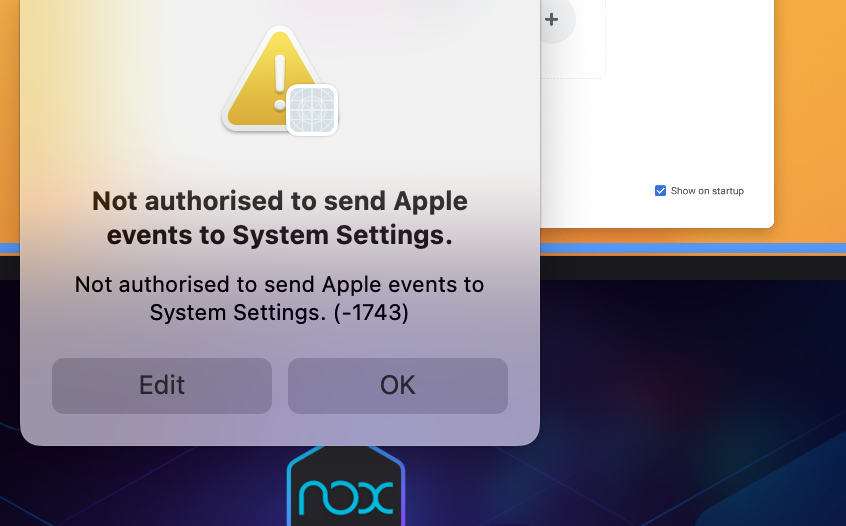 I've been trying to install an app and it asks me to send an apple event to system settings, I've tried to send one, but it gives me the same error: "Not authorised to send apple events to apple settings, is there any way to fix this issue?