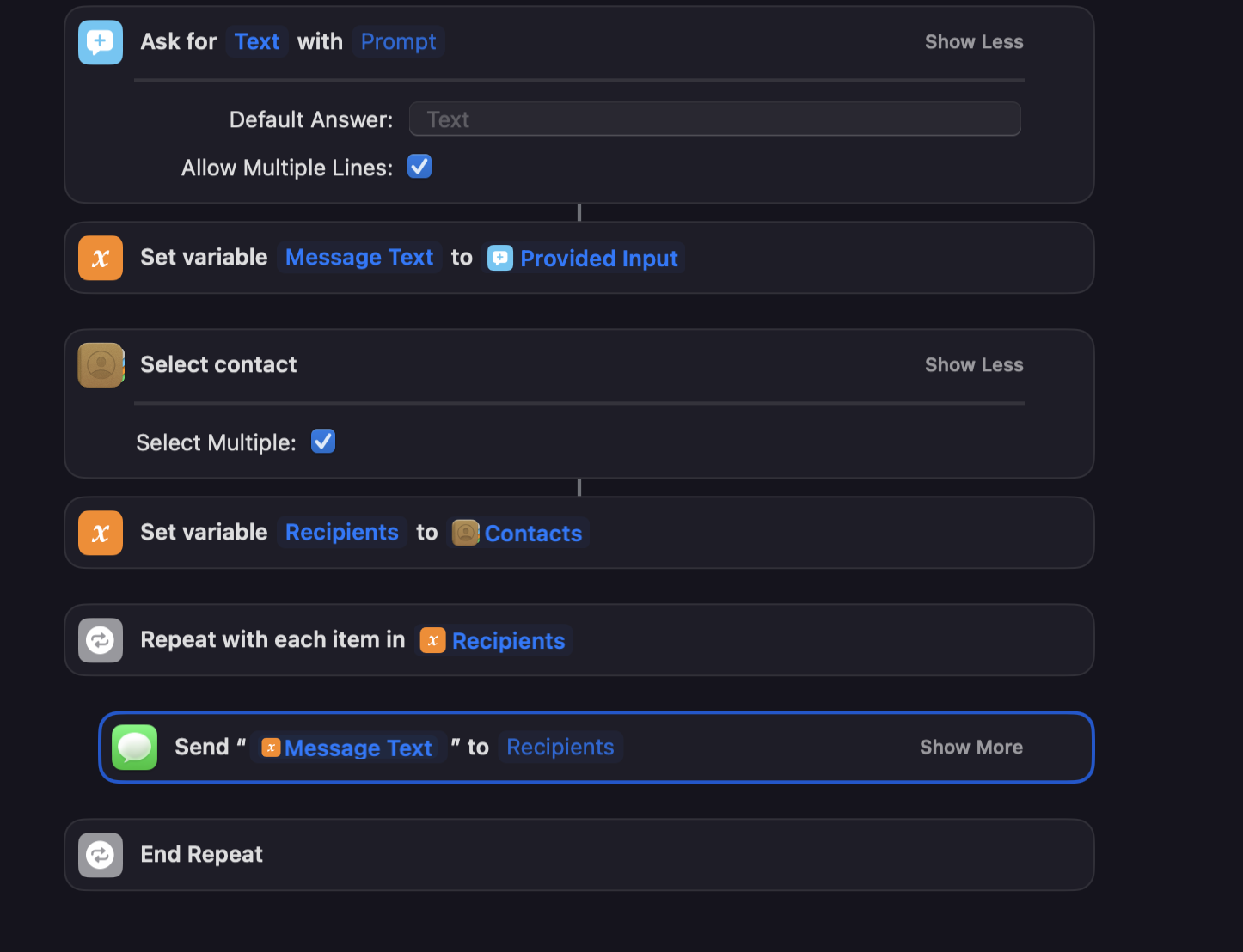 DialingByName ~ I created a custom shortcut to send multiple iMessages. Here's the iCloud link: