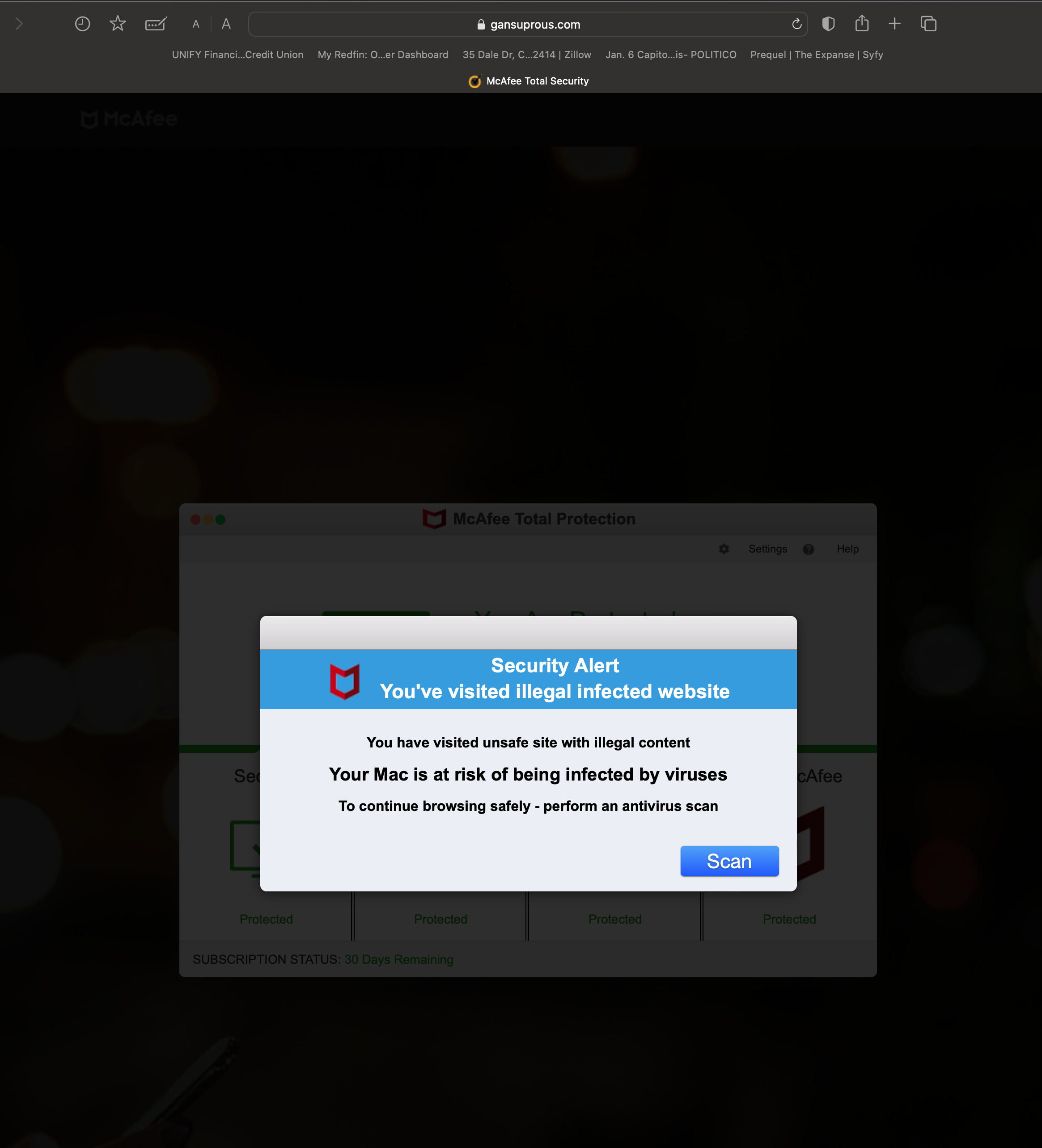 Recently a very strange little alert has popped up on my Mac mini screen a number of times. Most recently a few minutes ago. It goes away very quickly but I managed to click on it and it took me to this website. I did not click the "Scan" button.