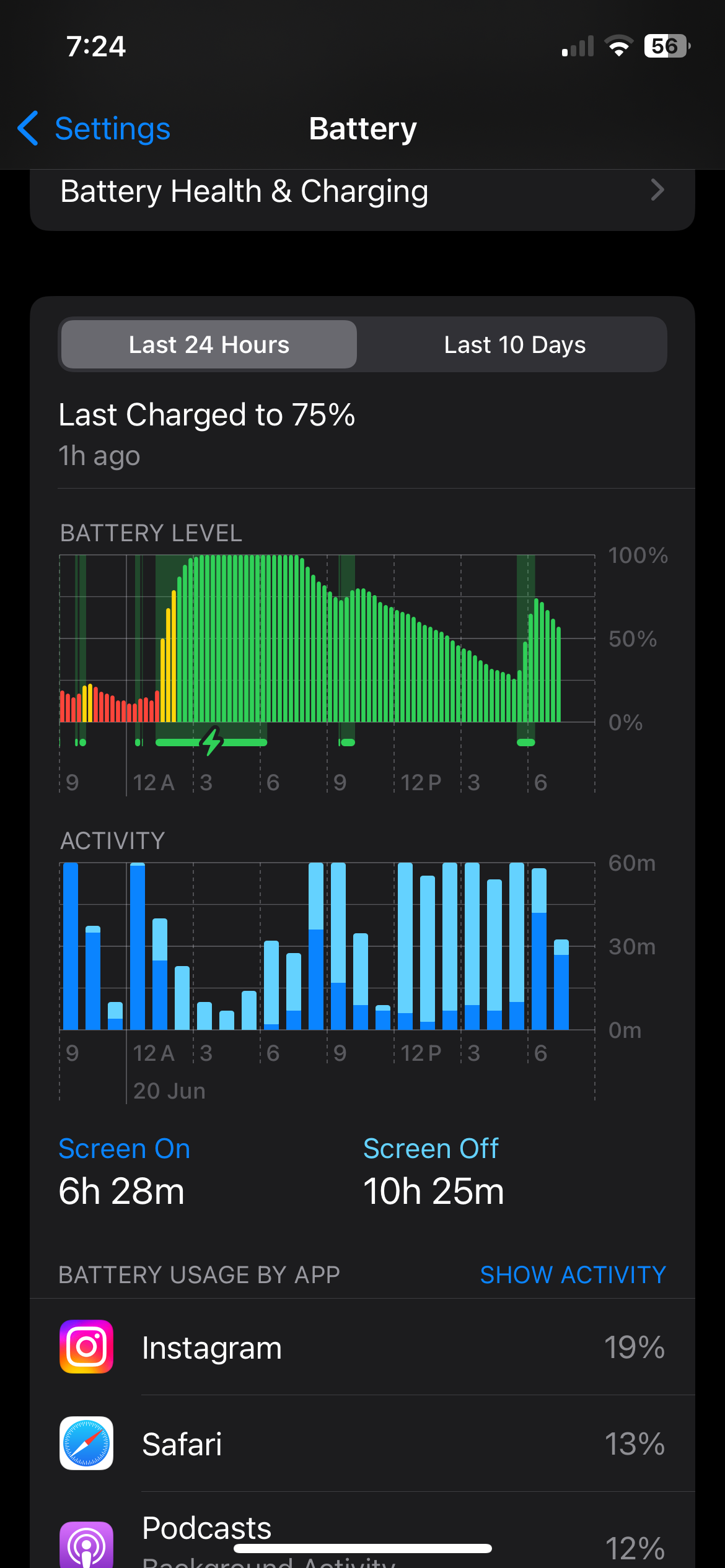 My iPhone's Screen Off usage seems to have increased (take a look at the last 10 day usage image below, it shows a spike from Wednesday). The phone drains out when not is use. Leaving it idle at <30% drains to 0 in <4 hours. The Battery Usage by App seems normal and does not show anything alarming. Any idea what could be the cause or fix here?