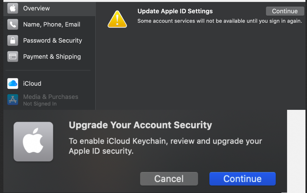 When trying to activate Keychain sync with iCloud checkmark on the iMac, I got various boxes about needing end-to-end encryption updates. In that process I got boxes asking for login-admin ID's for my other Apple devices, i.e., MacBook Pro, iPhone. It was a very slow process taking 5-10 minutes between the ask boxes. Then, It started to loop the same ask boxes one or two cycles, eventually ending up with iCloud Keychain unchecked. Now I'm getting a red dot on System Preference dock icon after start up saying... Update Apple ID Settings (caution triangle). When trying I get caught in the same loop.