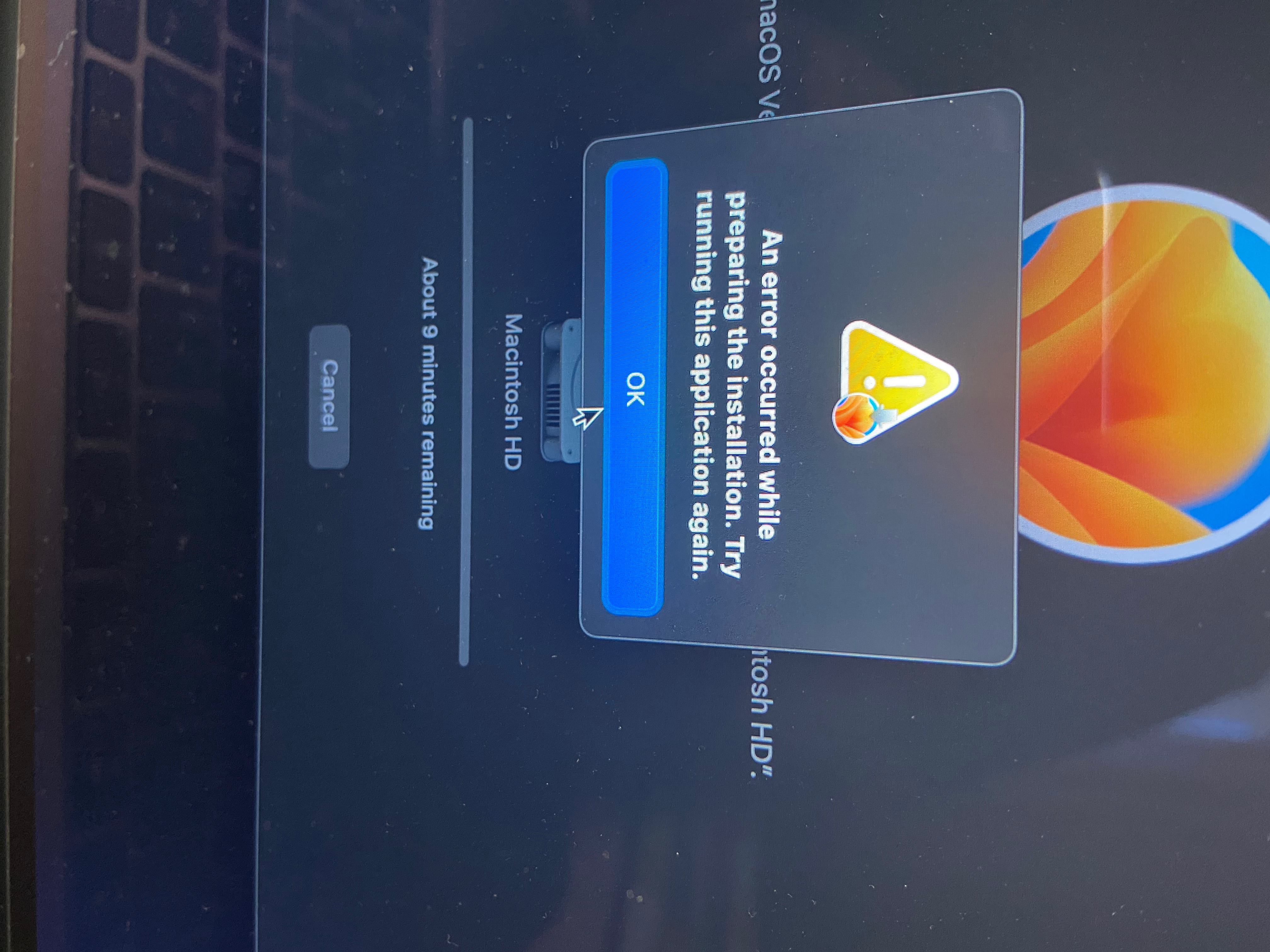Reset the macbook to factory settings. And it does not work through macos recovery to install macOS Ventura. I tried it several times and gives the same error when there are 9 minutes left until the end. I use the Macbook air on m1