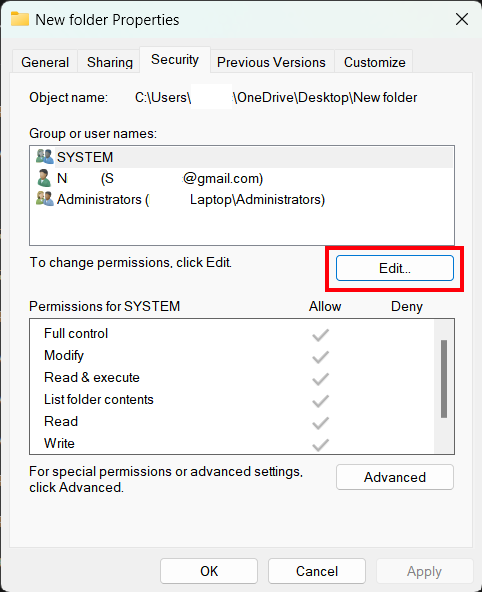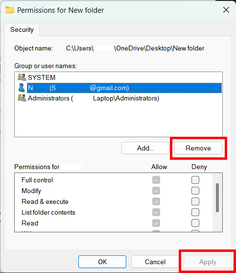 Once in the edit permisions tab, completely remove the LOGGED ON user permision. There will be 2 different ones, one of them will be labeled as "USERS", the other one that you will need delete/remove is labeled as "Your Name (Your MS Acount Email)"