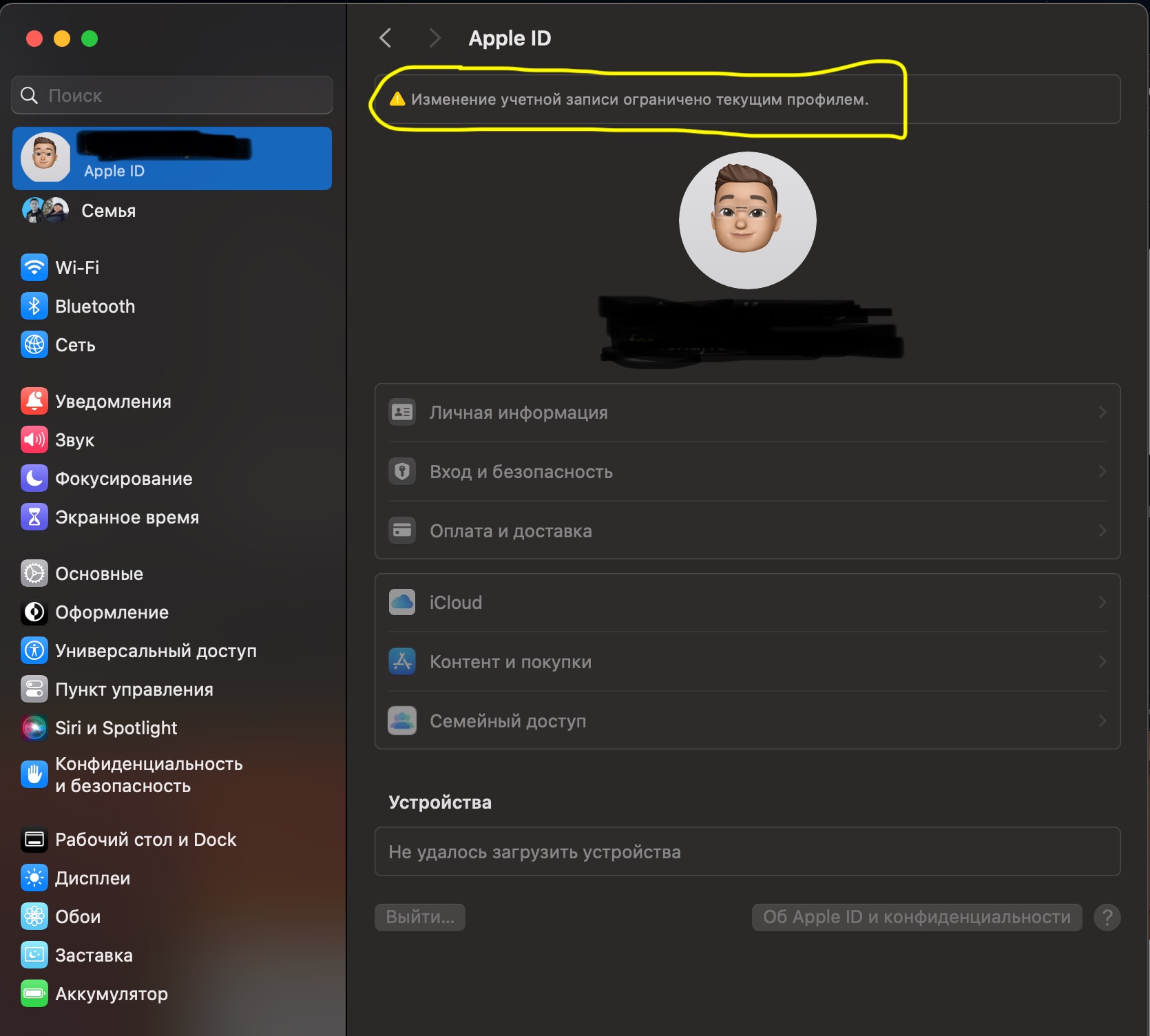 На моем MacBook Air заходя в настройки Apple ID появилось сообщение “изменение учетной записи ограничено текущим профилем» и нет возможности изменять настройки Apple ID я эти не выставлял, как их убрать
