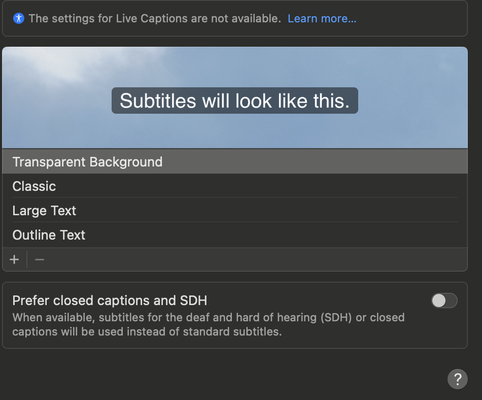 Clicking on learn more just brings up the help for Change Captions settings for accessibility on Mac, and these make no reference to Live Caption settings not being available.