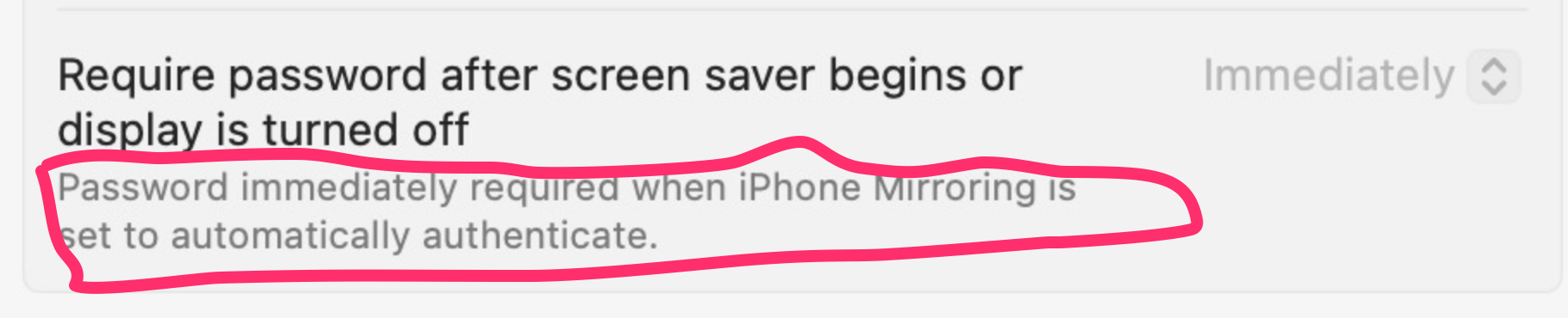The type I circled is grey and I noticed that. It is informative, not an option. If you want "Immediately" to become black and to have options other than than Immediately, you to need to set iPhone Mirroring to something other than automatically authenticate as instructed in the grey instructions that I circled in red.