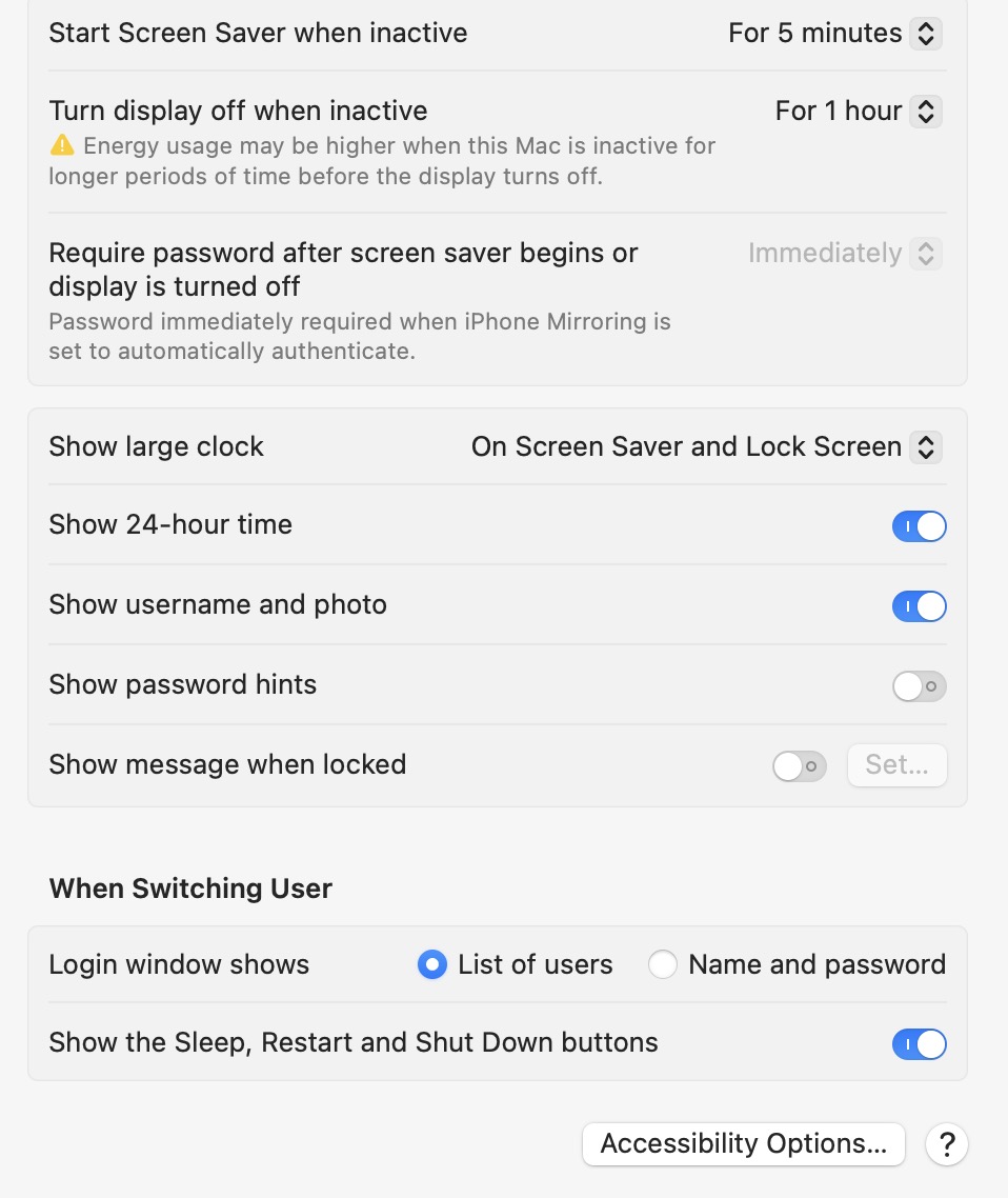 I tried that, it doesn't work. On another thread I found that my iMac, even though it passes in the 'set of requirements', my Mac allowed the osMac 15.0 upgrade, but in the the 'Controller' section of the drop down System Information it says: "This computer doesn’t contain any Controller devices". This in turn does not allow my Mac to support iPhone Mirroring, which again means I can't control the "Require password after screen saver begins or display is turned off" facility. Which means I have to bight the bullet and either get a new Mac, or the cheaper option — reload mac osMac 14, Sonoma. Thanks for trying to help, much appreciated.