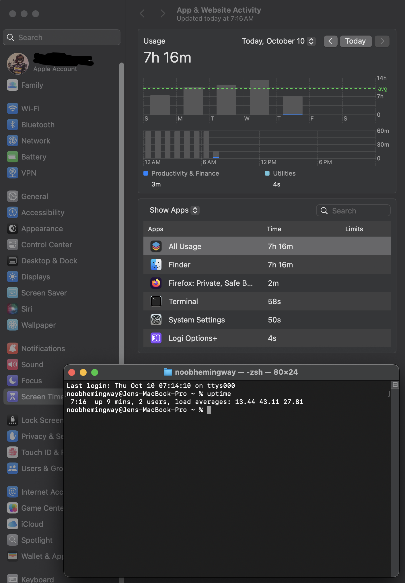 Today I noticed that the finder is not running in sleep mode. I turn on the Mac last day and I forgot to shutdown. Now I noticed the screen time status and uptime. In that finder screen time is 9s and the uptime is 22 hours, 44 minutes. Software bug from company side.