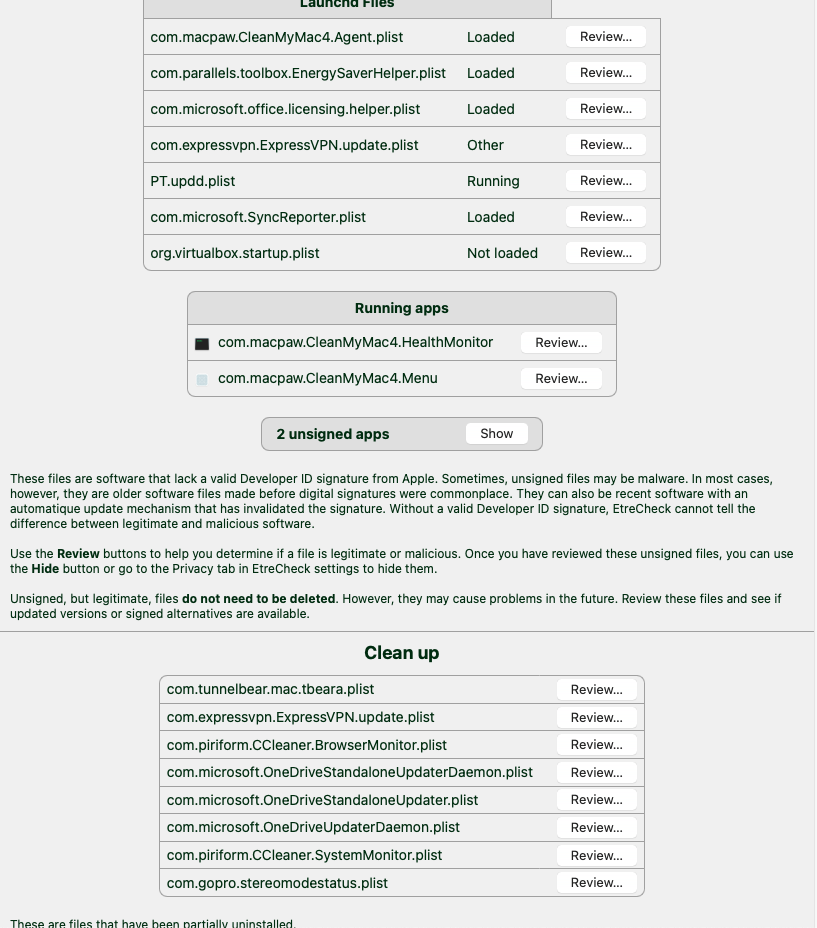Again, though, much of your Microsoft products are in that "partially uninstalled" list. So you may want to reinstall and uninstall some things - according to the developer's instructions, or at least use those "review" buttons in Etrecheck to find and/or delete the files.