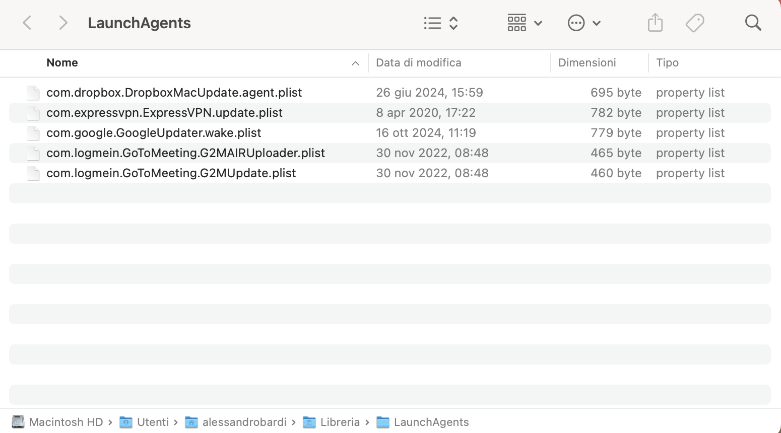 Quick aside - daemons are programs that run completely in the background. Agents are background programs that you interact with (they pop up dialog boxes and so on). You only have LaunchAgents in your home folder at /Users/<your name>/Library/LaunchAgents (sometime abbreviated as ~/Library/LaunchAgents). There is a folder for each in the root Library at /Library