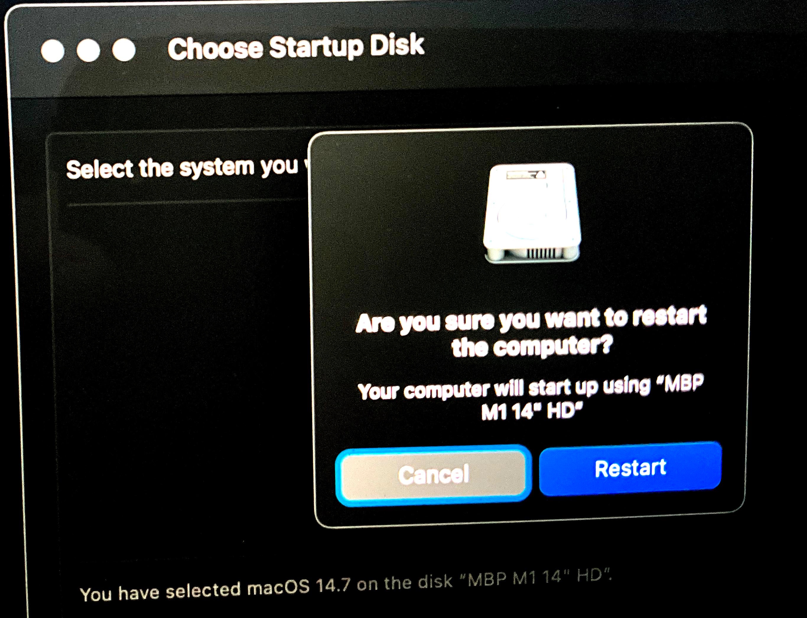 Then I go to Apple Menu > Startup Disk [C], go thru the process [D-E], and see “SDErrorDomain error 104” [F].