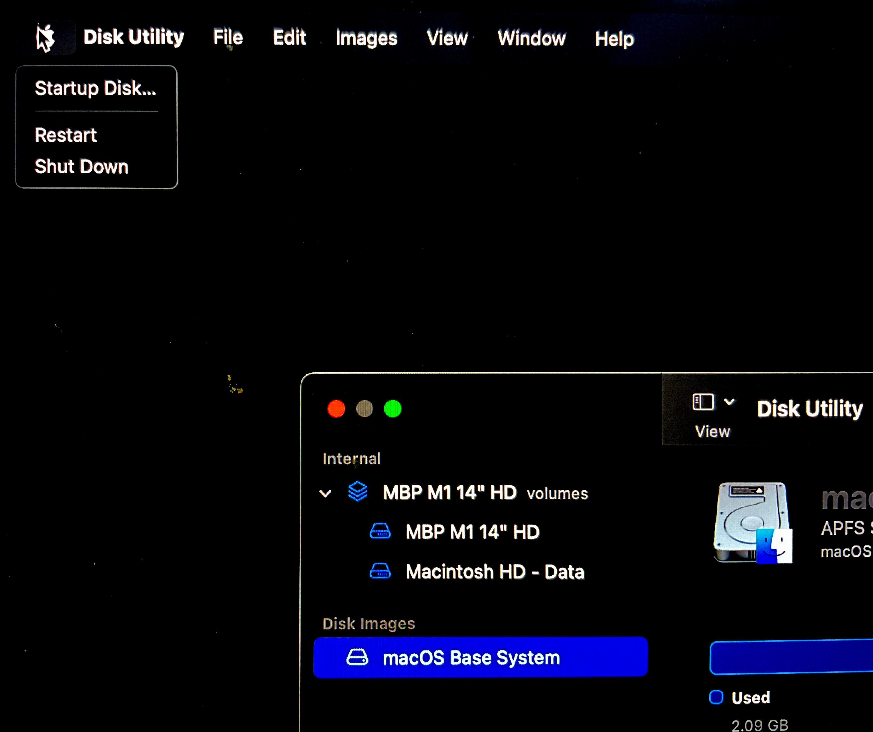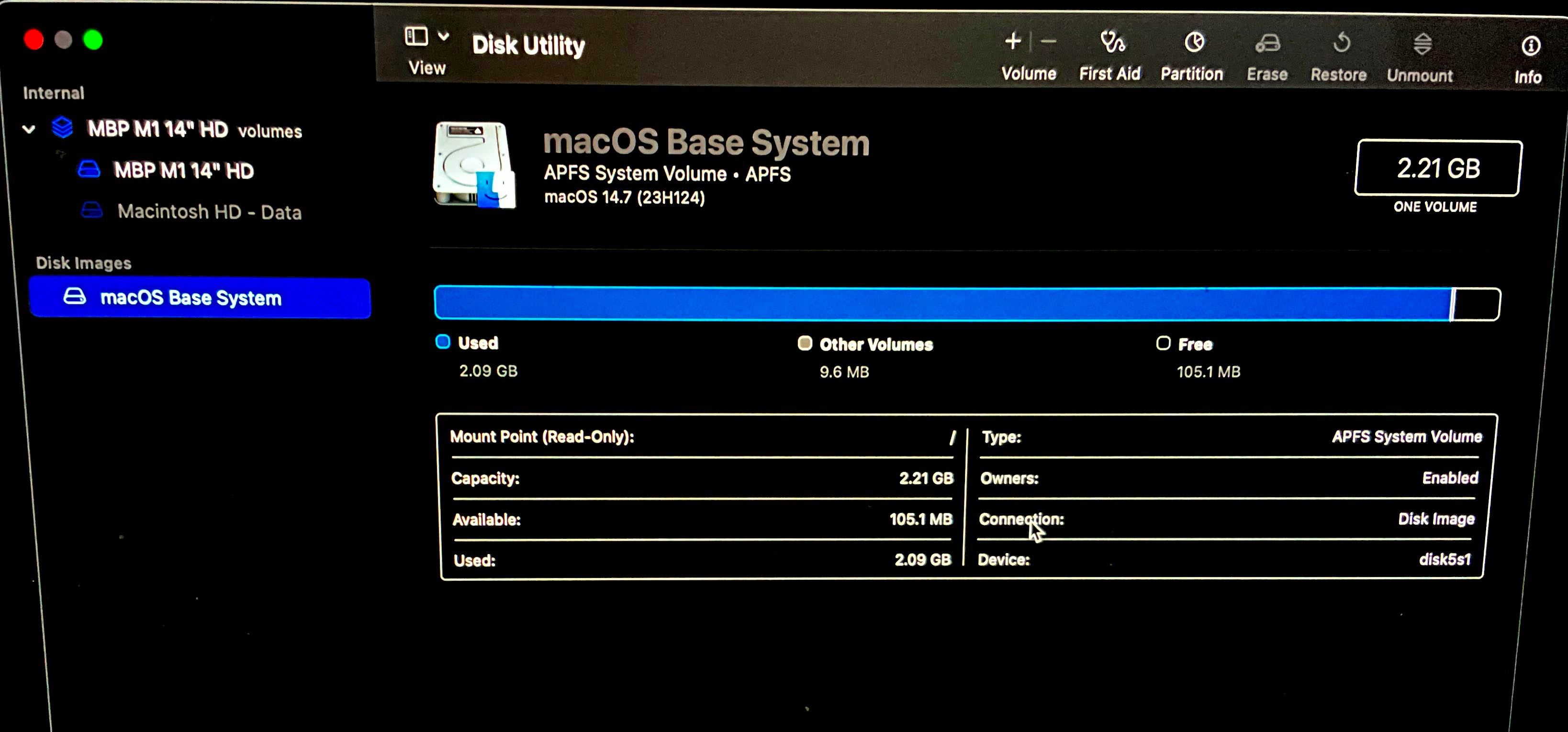 (I got a successful Disk Utility First Aid run on both Internal > MBP M1 14" HD volumes AND Disk Images > macOS Base System).