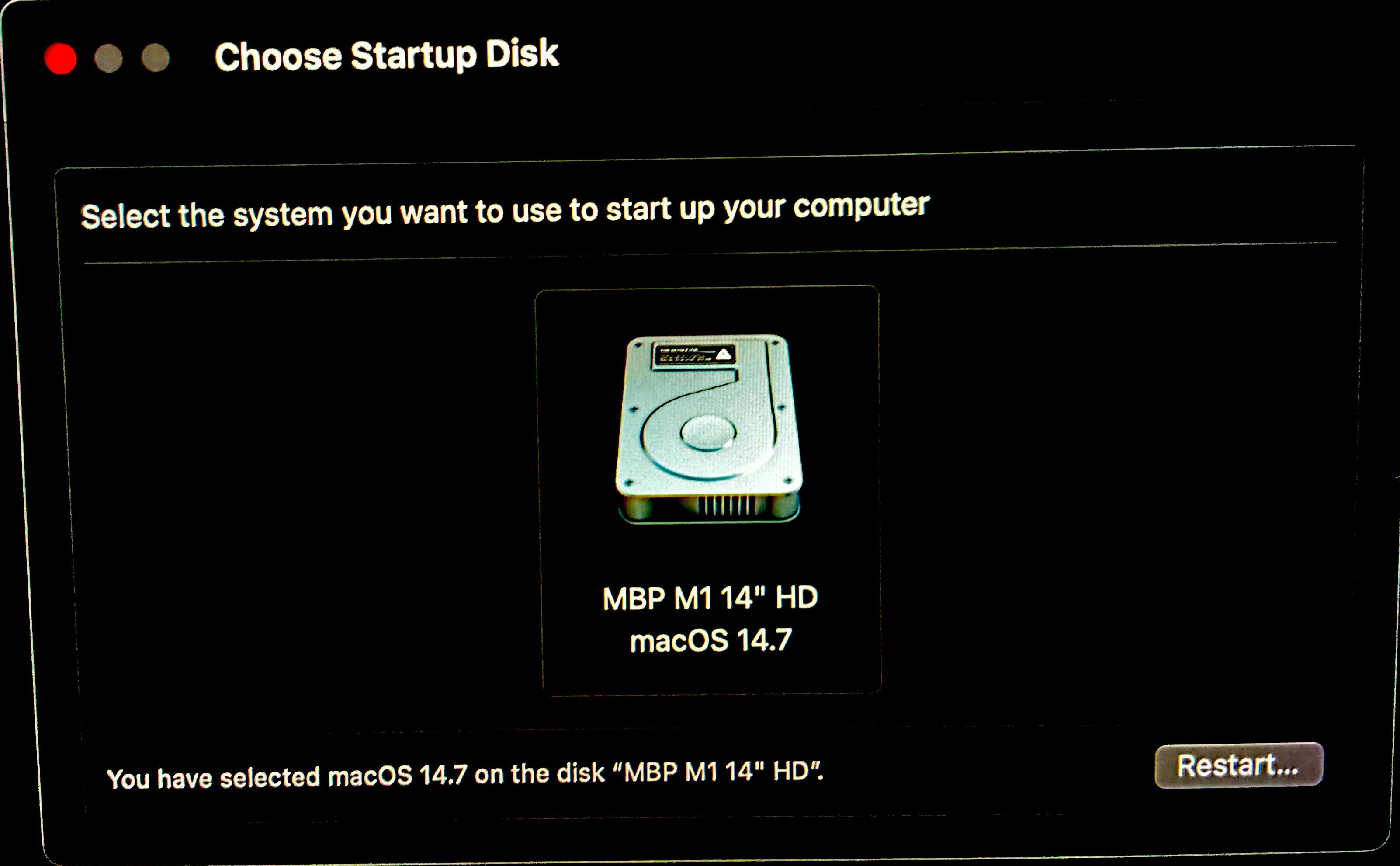 Then I go to Apple Menu > Startup Disk [C], go thru the process [D-E]