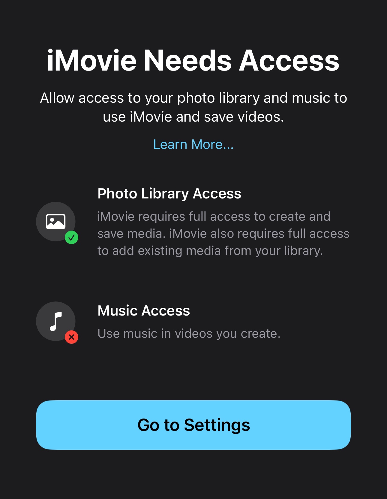 iMovie won't open due to missing music permissions on iOS