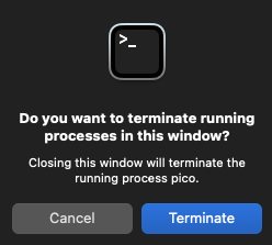 I started inputting some information into Terminal. At a certain point, I didn't have the result I wanted and wanted to make some changes. However, it seems I became stuck in the program PICO, which, as I understand is a word processor of some sort in Terminal. There are commands shown at the bottom of the Terminal window, within Pico, one of which is crtl X, which should allow me to exit from Pico to go back into the regular Terminal window; it doesn't work. If I close Terminal and restart it, for a split second, I can see the regular window before Pico takes over. If I restart in Recovery mode, then I can use a regular Terminal, but I cannot make any changes to try to erase any data connected to Pico. When I then restart the computer again, Pico is back in Terminal. I tried iTerm and another 'Terminal-like' program, but both of these had the same Pico within and I could not escape it. I want to escape Pico and get back to the normal Terminal window.