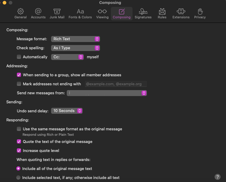 In my composing settings on both computers, there is no place to send messages to. Below it is shown in the third photo. It just says to send from my email account.