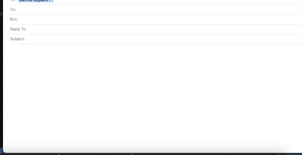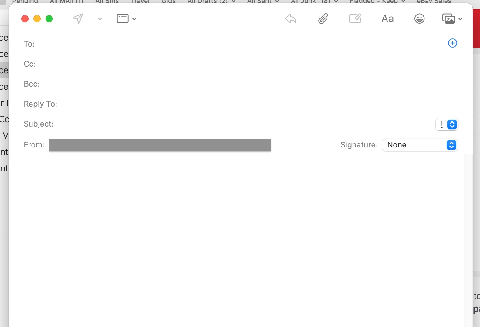 I will send photos for the other questions because I could not find answers in my MAIL program to reply to. I could not find a "from" box in either my iMac or my Macbook Pro. Below is a photo of a new email. Where is the "from" supposed to be? (first photo)