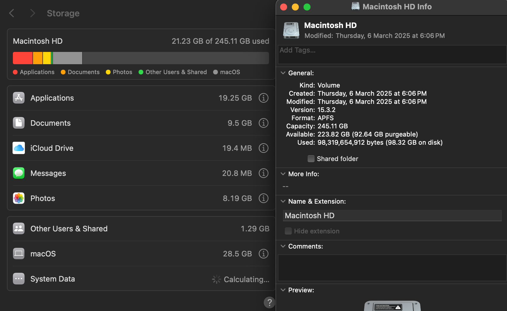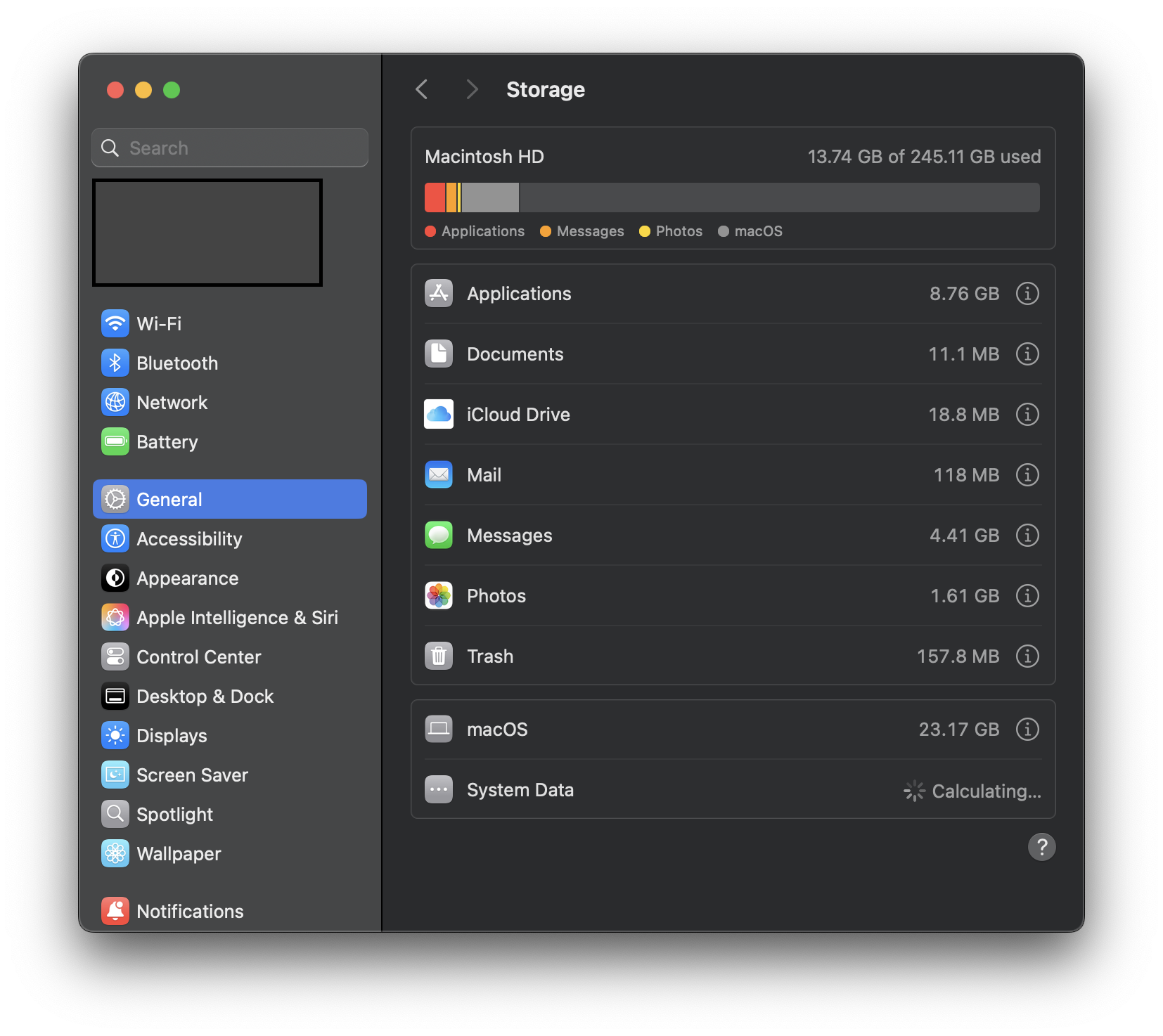 macOS Sequoia system storage won't calculate and total count is half of the OS alone.
