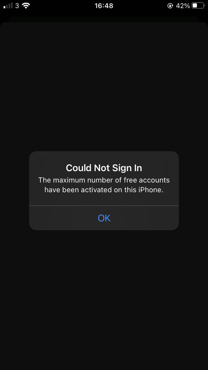 You can only sign in to 5 Apple Accounts per device. So, return this. You have been sold an unusable device. As the messages reads: "The maximum number of free accounts have been activated on this iPhone."