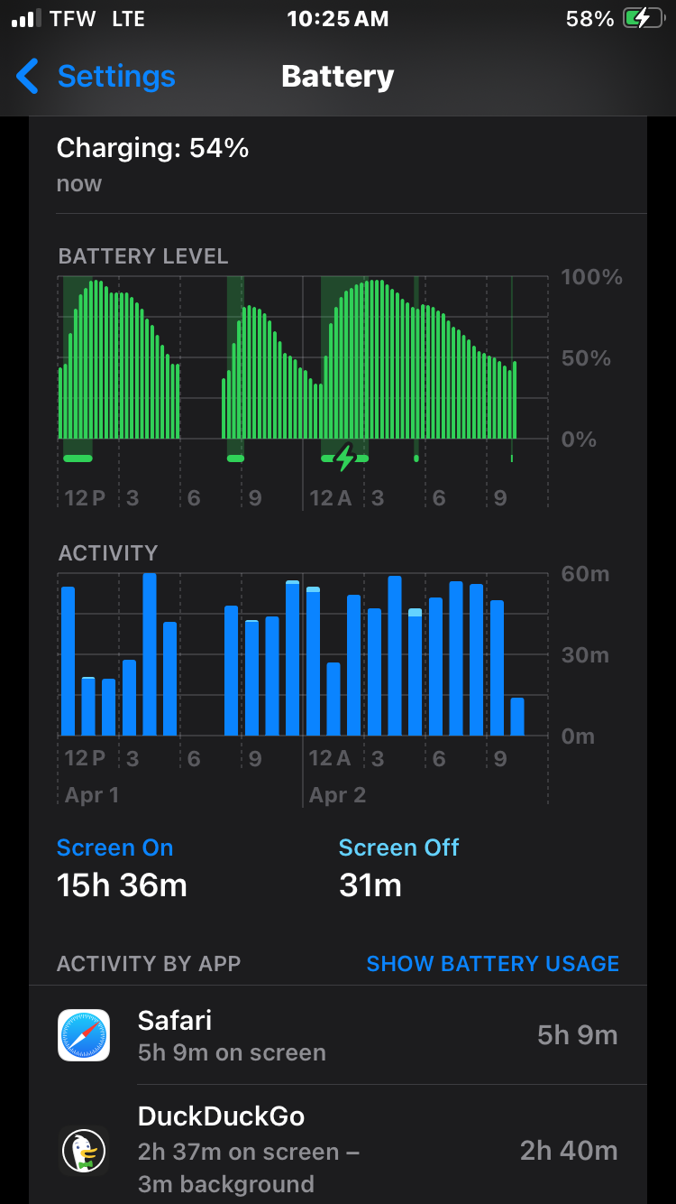 1. Per App, my battery percentage number no longer logically matches battery use stated. See pics.