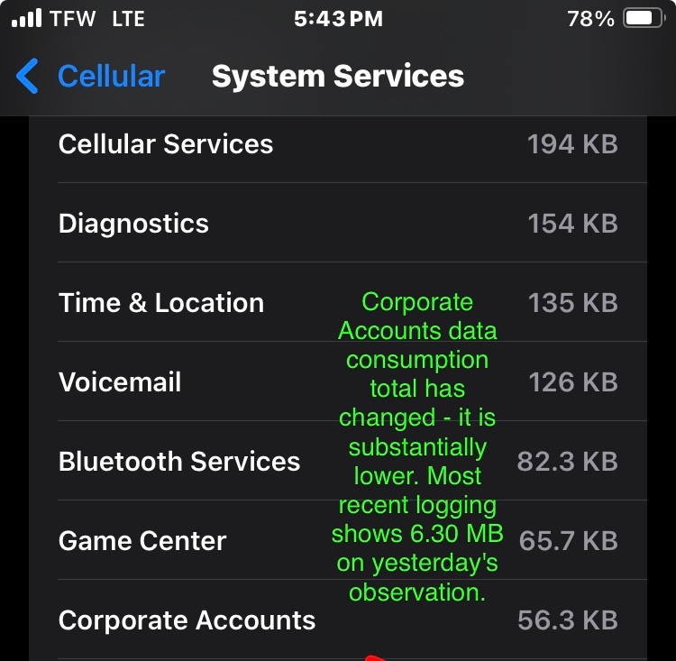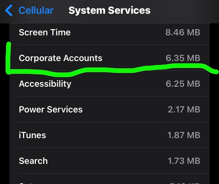 Odd iphone behaviors/activity I did not prompt. No one has physical contact with my phone. In System Services, I found "Corporate Accounts" that consumes cellular data daily, yet no profile exists under VPN and Device Management. I will add that I have had a stalker since 2019 with resources most of cannot imagine.