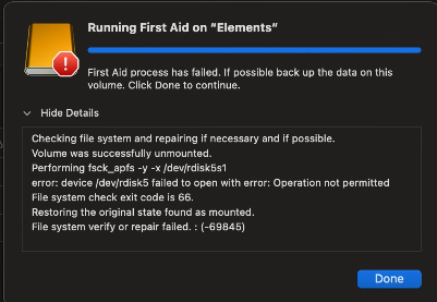 Also make sure to try using a different high quality USB-C USB3/4 cable (or Thunderbolt 3/4) cable from a well respected manufacturer. Many people resolve external drive issues by using higher quality cables from respected manufacturers. Same thing goes if you need to use any adapters. The cables supplied by the drive manufacturers are usually of poor quality.