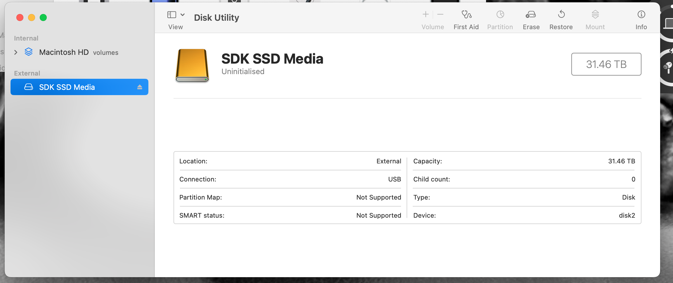 I've recently bought a new 30TB SSD extrenal drive for my MacBook. I've started disk utility and also terminal and have been unable to format it. I get a series of errors when trying. Running 'First Aid' it seems ok but no matter what I do I get an error. Please help. I'm currently waiting on the supplier to get back to me about this but just wondered if it's a quick fix and I'm doing something wrong.