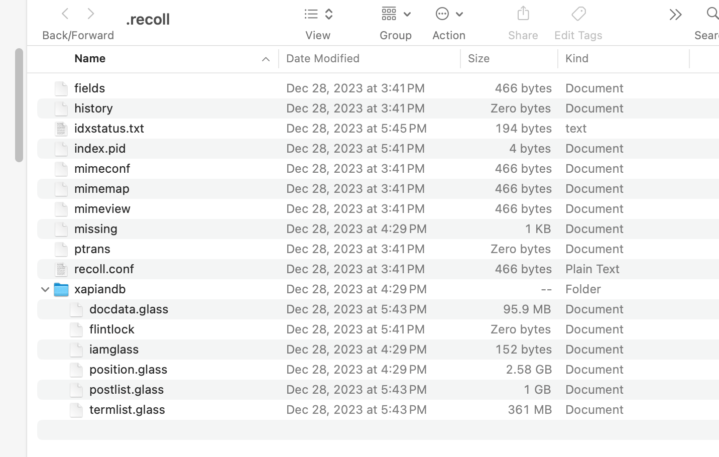 I was looking through the large files on my macbook pro running Sequoia, and I came across a large file called "position.glass" which was 2.6Gb. This file was contained within a hidden directory called ".recoll ".