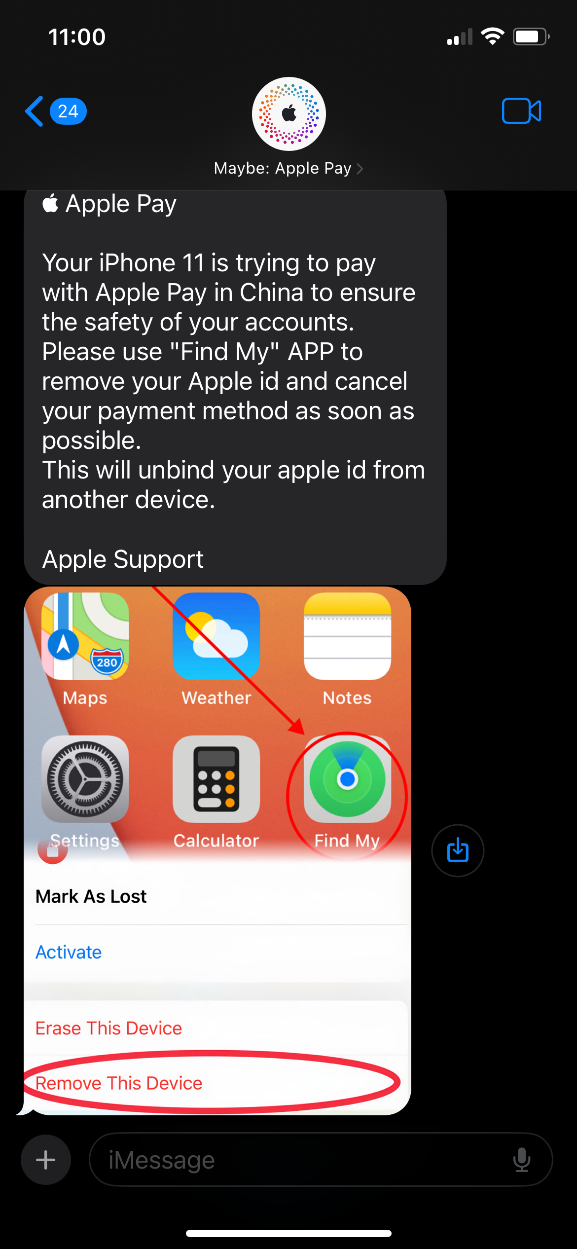 my iphone 11 was stolen in march, i just received a text from “Apple Pay” (only contact info an email: ap*****ay@icloud.com) telling me my phone is trying to use apple pay in china and i need to remove the phone from my account. everything else i’ve read has said don’t remove your phone from your account. is this a scam? there’s no links to click on or anything it’s just telling me to remove the phone from my account.