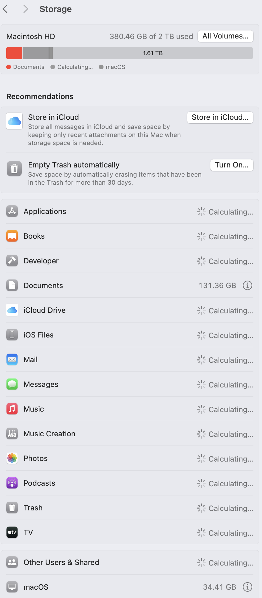 When trying to view storage, the numbers calculate endlessly. This will go on for hours if I let it.