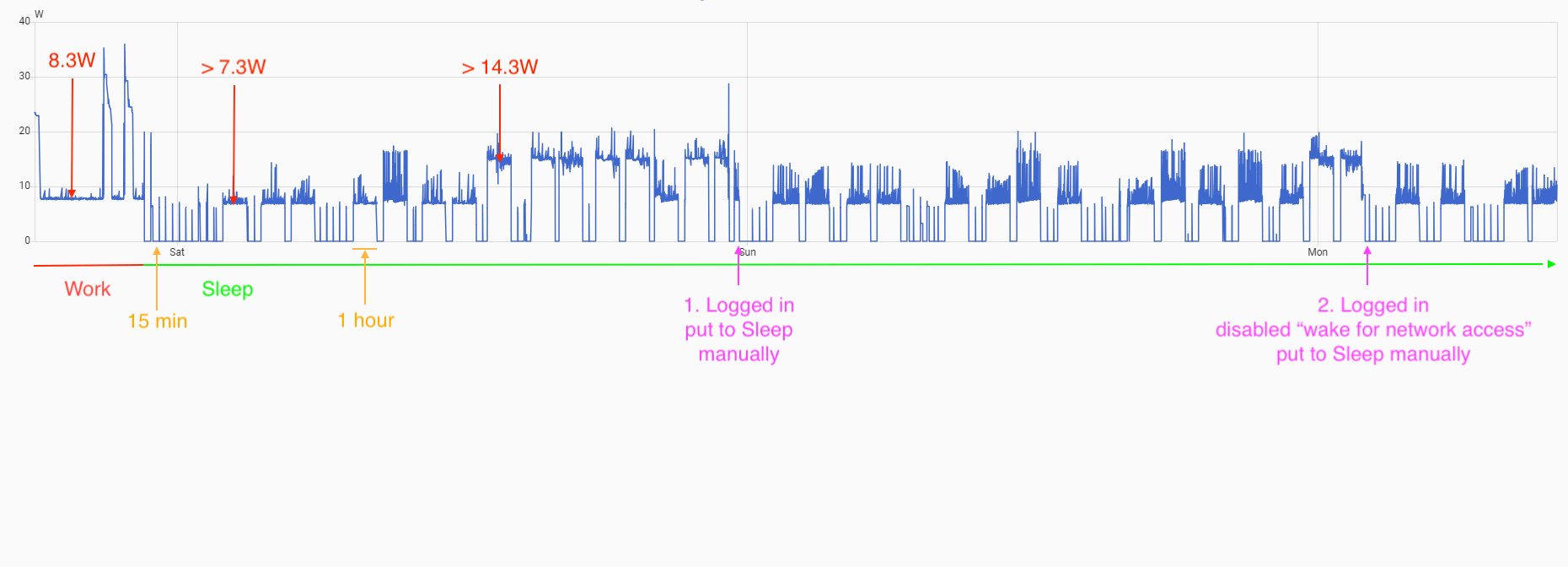 Then I put it to sleep manually (Apple->Sleep). It goes to almost 0W with regular wake ups on 15 min period.