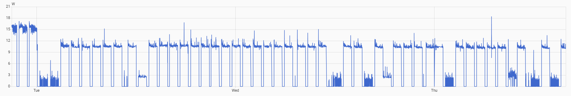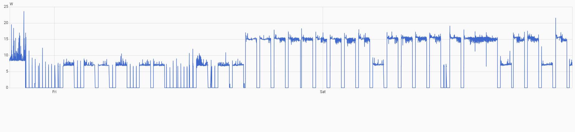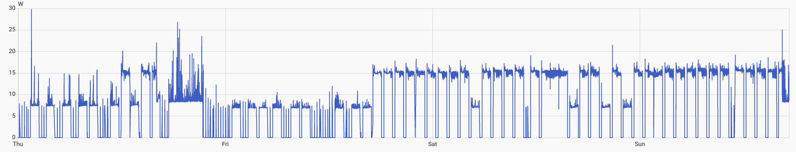 After several such cycles, it decides to power up even more, consuming >14.3W and again runs one hour blocks, separated only by one or two 15 min periods of sleep.