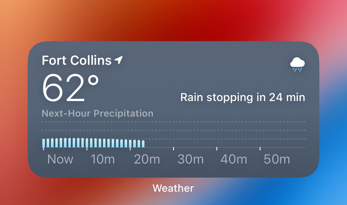 In the Weather widget, and also the StandBy weather pane, when there's precipitation now or soon a chart with vertical bars is shown - but there's no label or scale!? Do the bars represent probability of precipitation, intensity (light, heavy, etc.), or what? An earlier similar question was obviously not clear so here's a screenshot snippet: