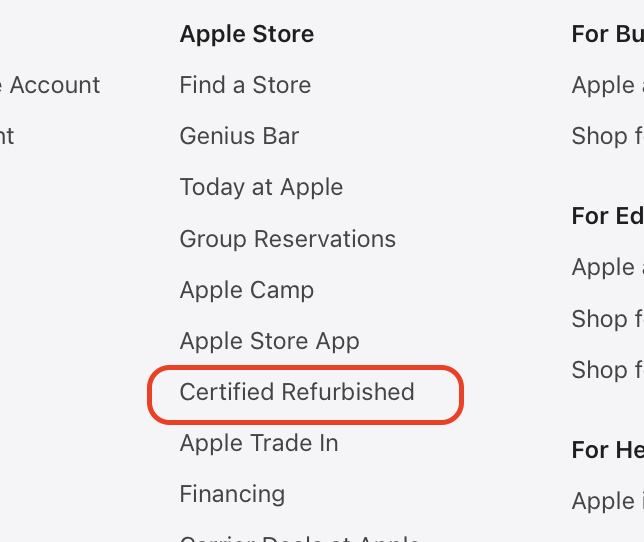 True Apple factory refurbs are only available in certain countries and from the Apple online store. Go to the bottom of your country's Apple home page and look for this among the small gray links there: