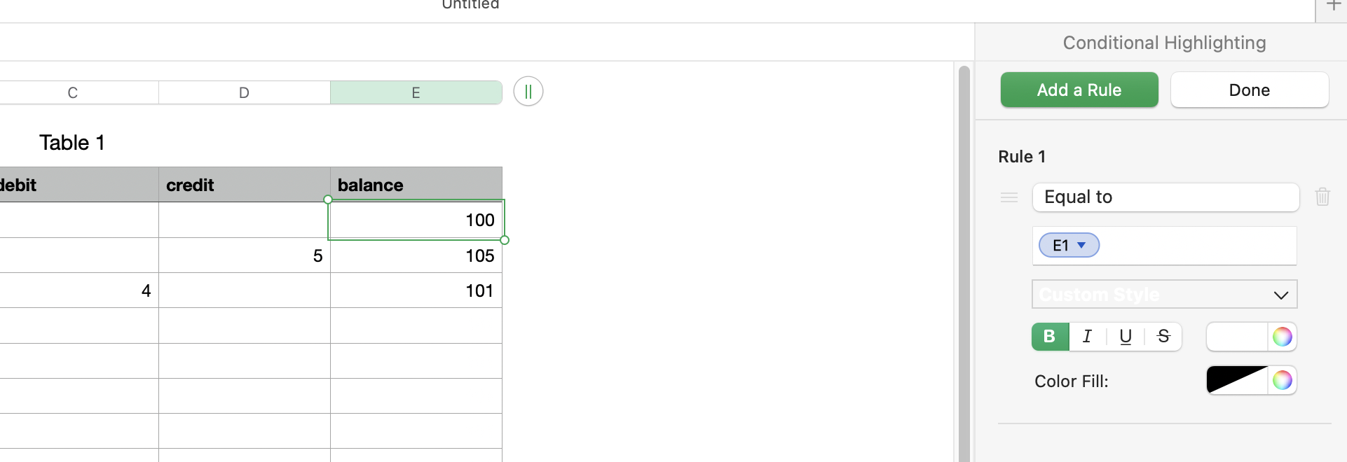 3. In the place where you see E1 in my rule, click on the green oval, click on the cell E1, edit it if necessary so it is E1 not E$1, then use the checkmark to accept it. This will make sense when you see it.